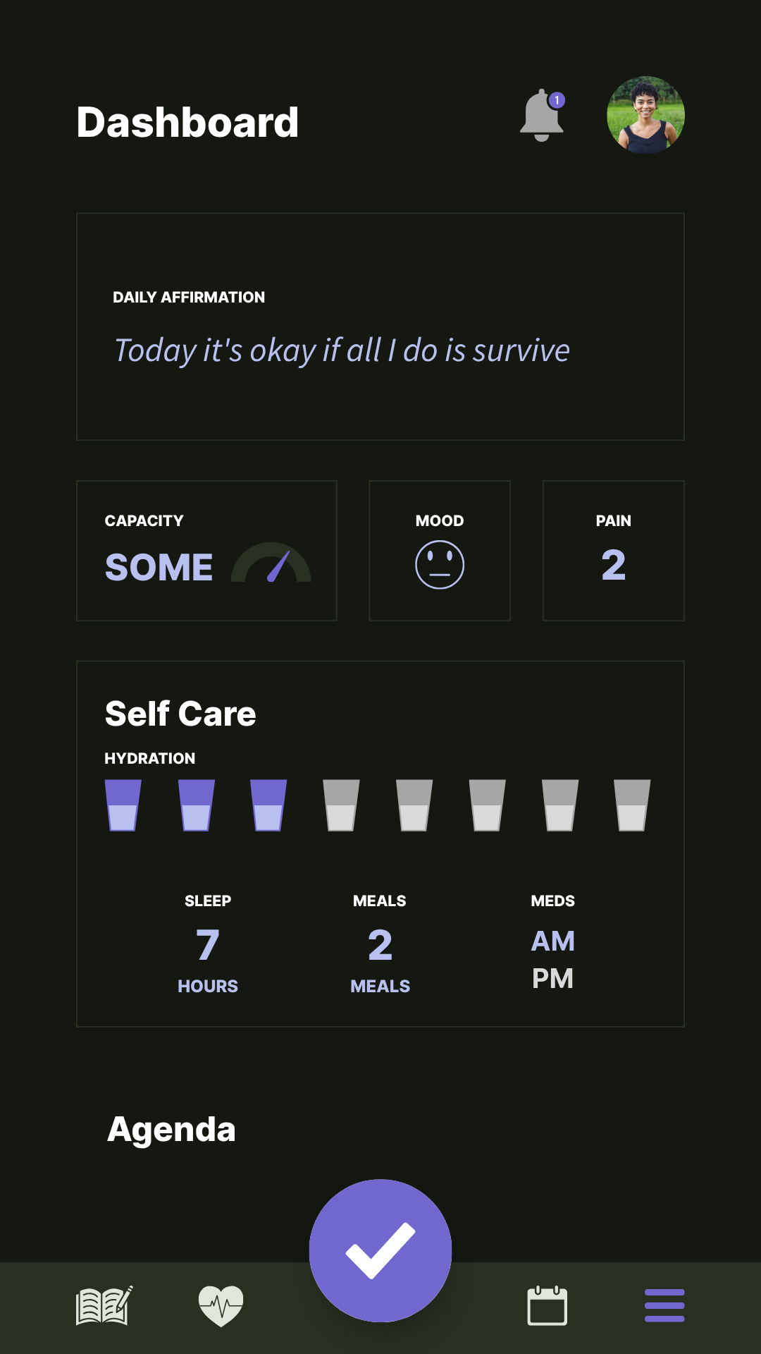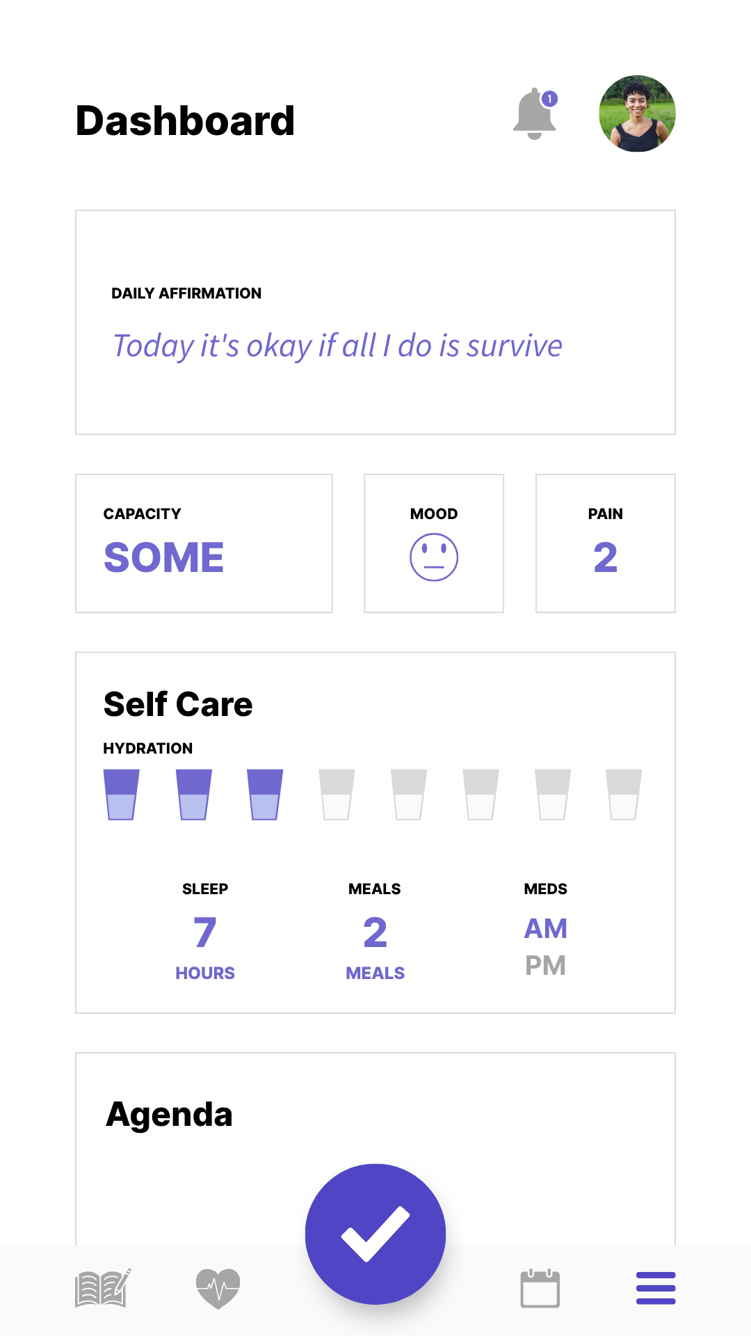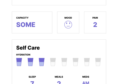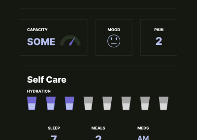 Tracks mood, pain, energy, hydration, meals, medication, and daily reflections to estimate capacity. Future updates will include medical, social, and identity-based factors that shape functioning.