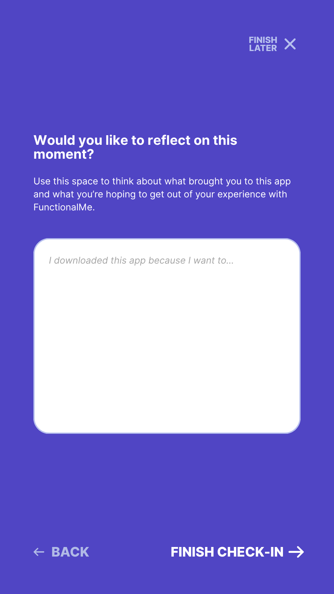 FunctionalMe is still in an experimental stage and has not yet been tested. Because of that, every feature should be treated as a prototype, not a proven intervention. Some ideas that sound promising could have unintended consequences or worsen symptoms for certain users. There are also mental health conditions that may respond unpredictably to how some features are designed. Extreme care is needed before this app can be made widely available or represented as a treatment tool.