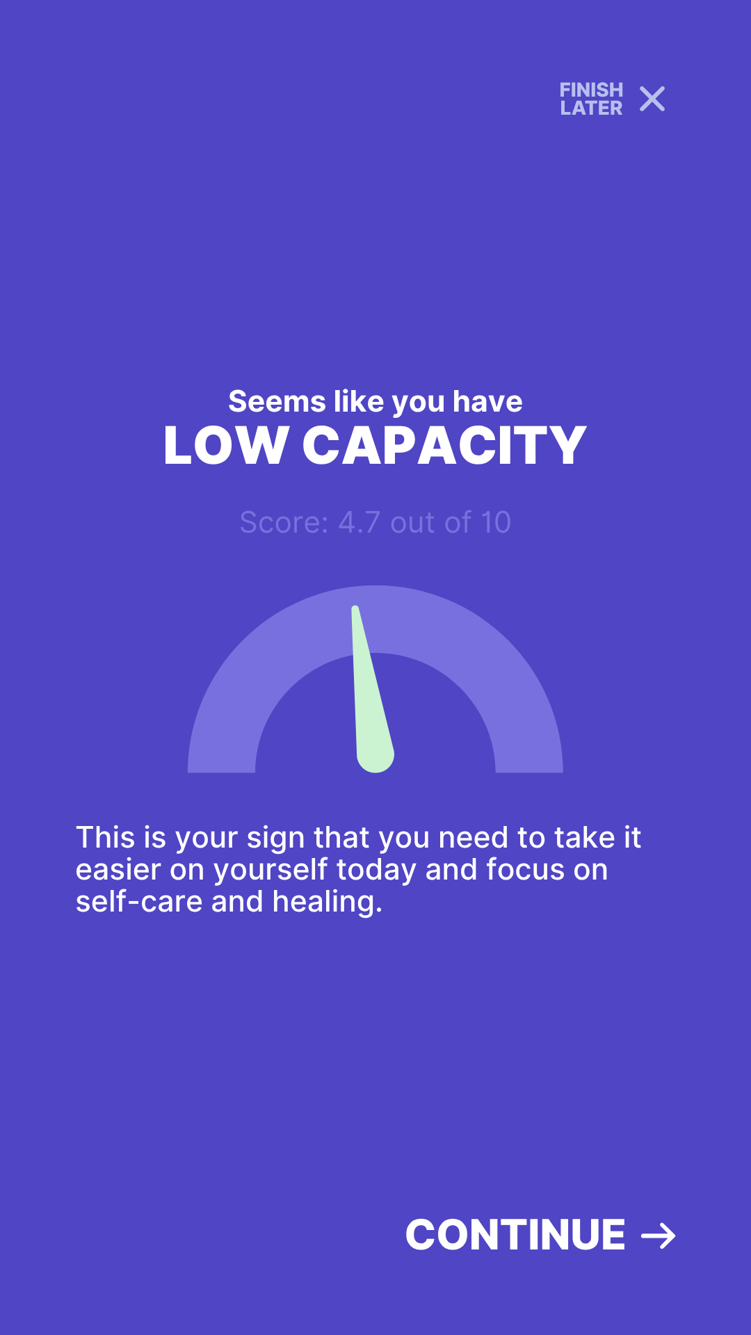 A central concern is interpretation. The capacity calculation is meant to inform, not define, the user’s choices. If a user sees a “low capacity” rating and interprets it as a reason to avoid friends or skip daily care, the feature would be doing harm. The goal is to help users respond with self-compassion, not withdrawal: “I have low capacity today, so I need to rest or focus on recovery,” rather than “I can’t function today.” Testing and feedback will be essential to make sure that distinction stays clear.