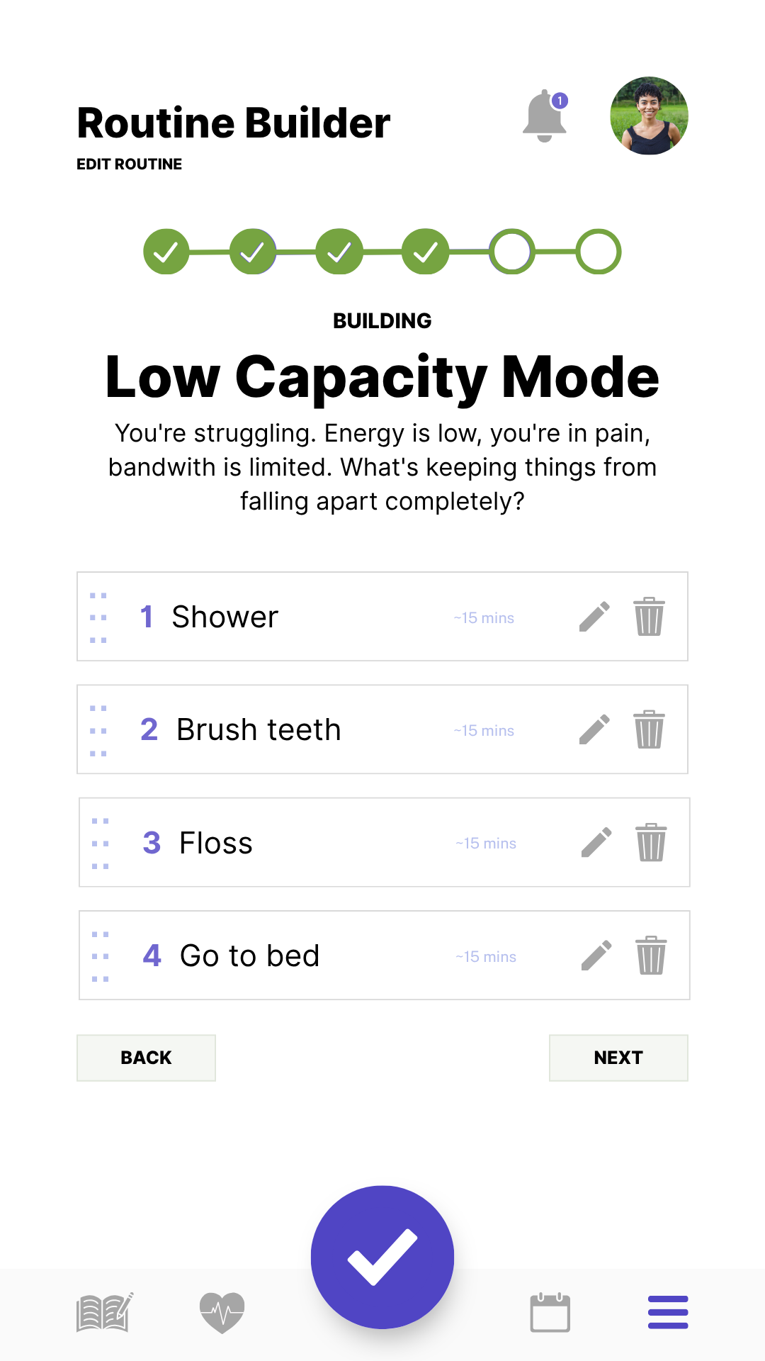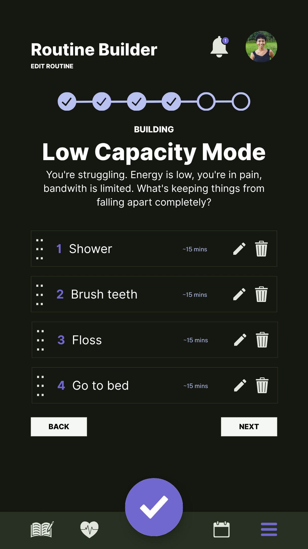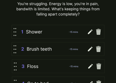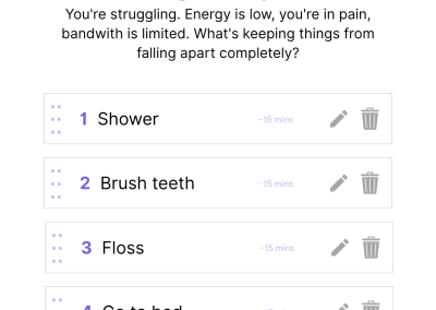 Users create flexible routines that adjust to high, some, low, or survival mode days. The app reshapes tasks around current capacity and recommends when to rest or reschedule.