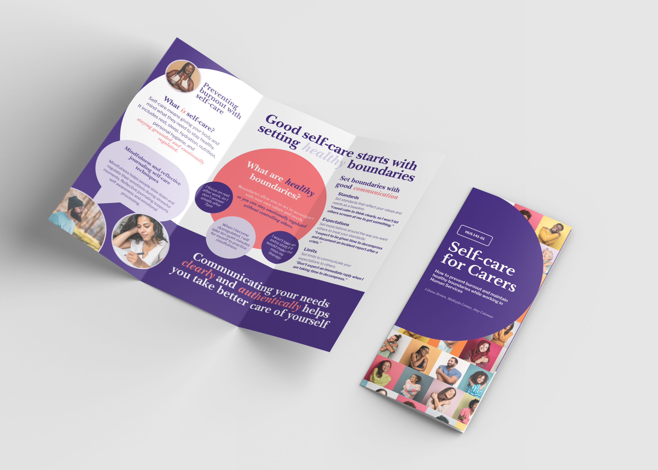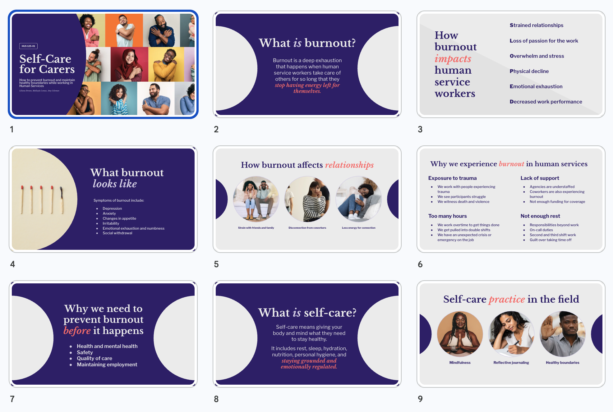 How to prevent burnout and maintain healthy boundaries while working in Human ServicesA group facilitation project for HUS 125-01. Groups were asked to choose a topic in human services and create a presentation and pamphlet informing the rest of the class about that topic. We chose an ambitious topic: burnout and self-care in the field.